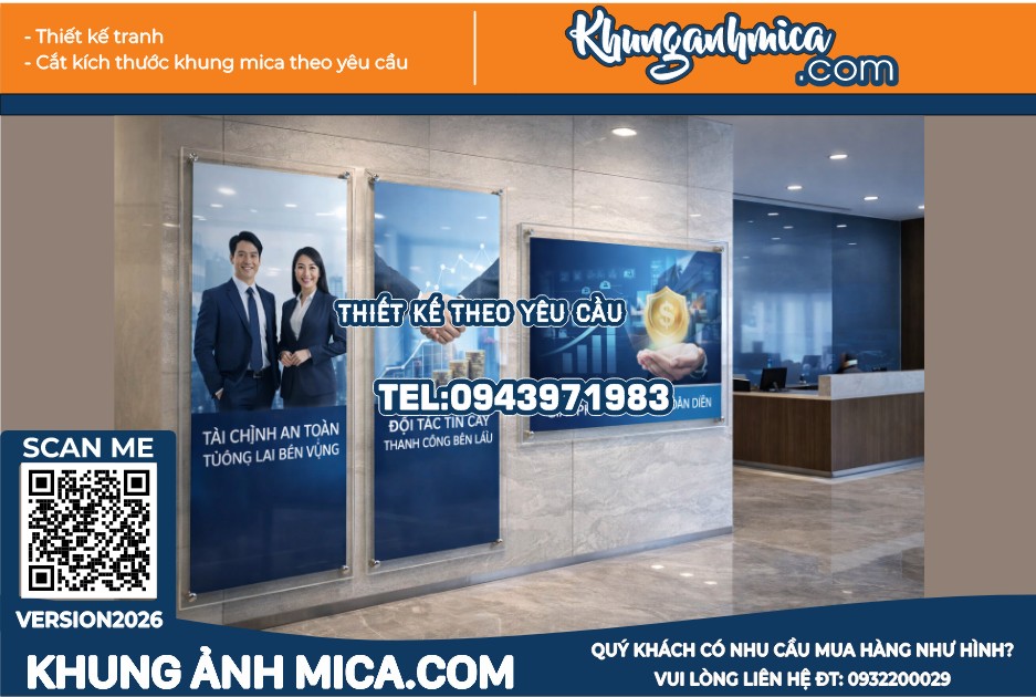 Với khả năng hiển thị rõ nét, độ bền cao và tính thẩm mỹ vượt trội, khung mica treo poster kích thước lớn là lựa chọn hoàn hảo cho các khu vực sảnh lớn như tòa nhà, trung tâm thương mại, ngân hàng và công ty bảo hiểm. Đây chính là giải pháp giúp nâng tầm không gian và cải thiện trải nghiệm người dùng một cách hiệu quả.